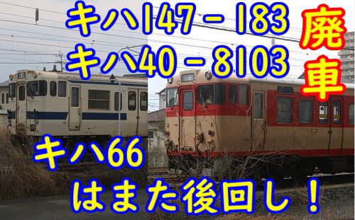 こんにちは! 今回はJR九州に関する記事になります。2022年秋のダイヤ改正において引退し、その後およそ1年ほど川尻電留線に疎開されていたキハ147‐183とキハ40 8103の廃車回送が9/6~7にかけて行われたようです。 ↑ キハ147‐183とキハ40 8103の川尻疎開の様…