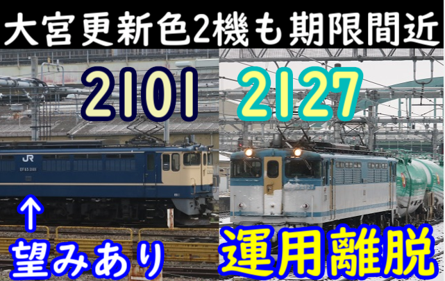 これらの2機のうち、2127号機については、2017年2月に全検を受けており、(機関車の検査スパンは6年です)検査期限が迫っています(もしくは既に切れている可能性もあり)。2127については、休車期限などを考えても既に検査切れ、もしくはぎりぎりの状態となっているため、既に引退のための運用離脱となっている可能性が高く、このまま引退する可能性が高いです。一方で、2101号機については、2018年7月に全検を受けており、まだ検査期限まで1年ほど余裕があるため、復帰する可能性があるのではないかと思います。しばらく離脱した後に、台検を受けて復活するのではないかと期待しています。